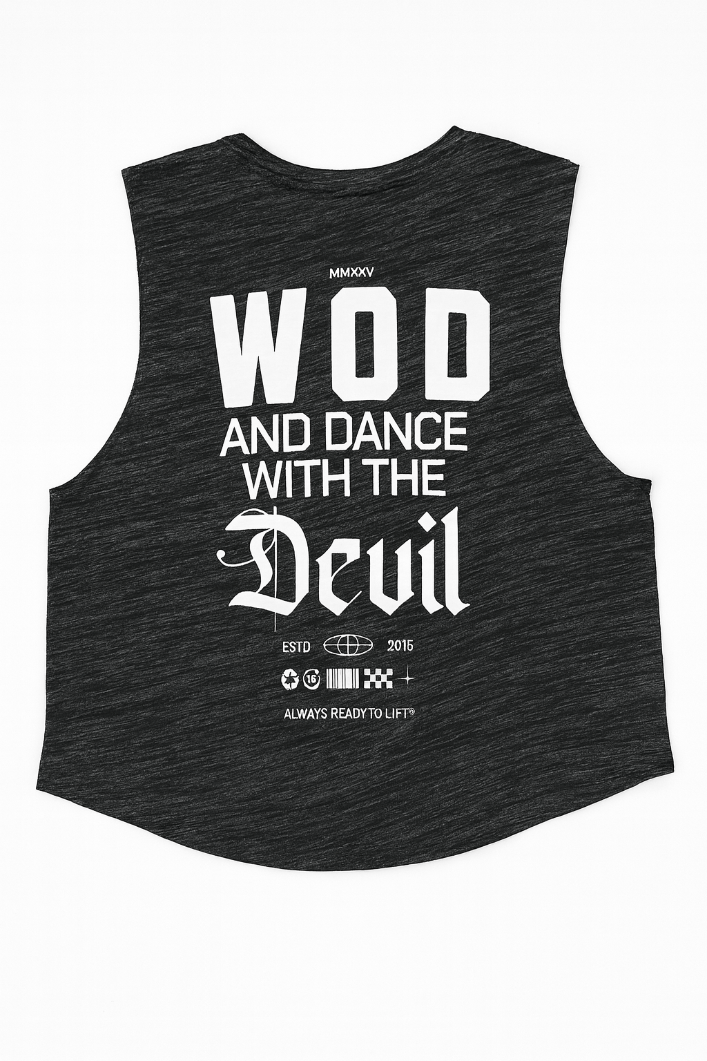 “WOD AND DANCE WITH THE DEVIL”, acompañado de símbolos gráficos que refuerzan la vibra underground de la prenda.