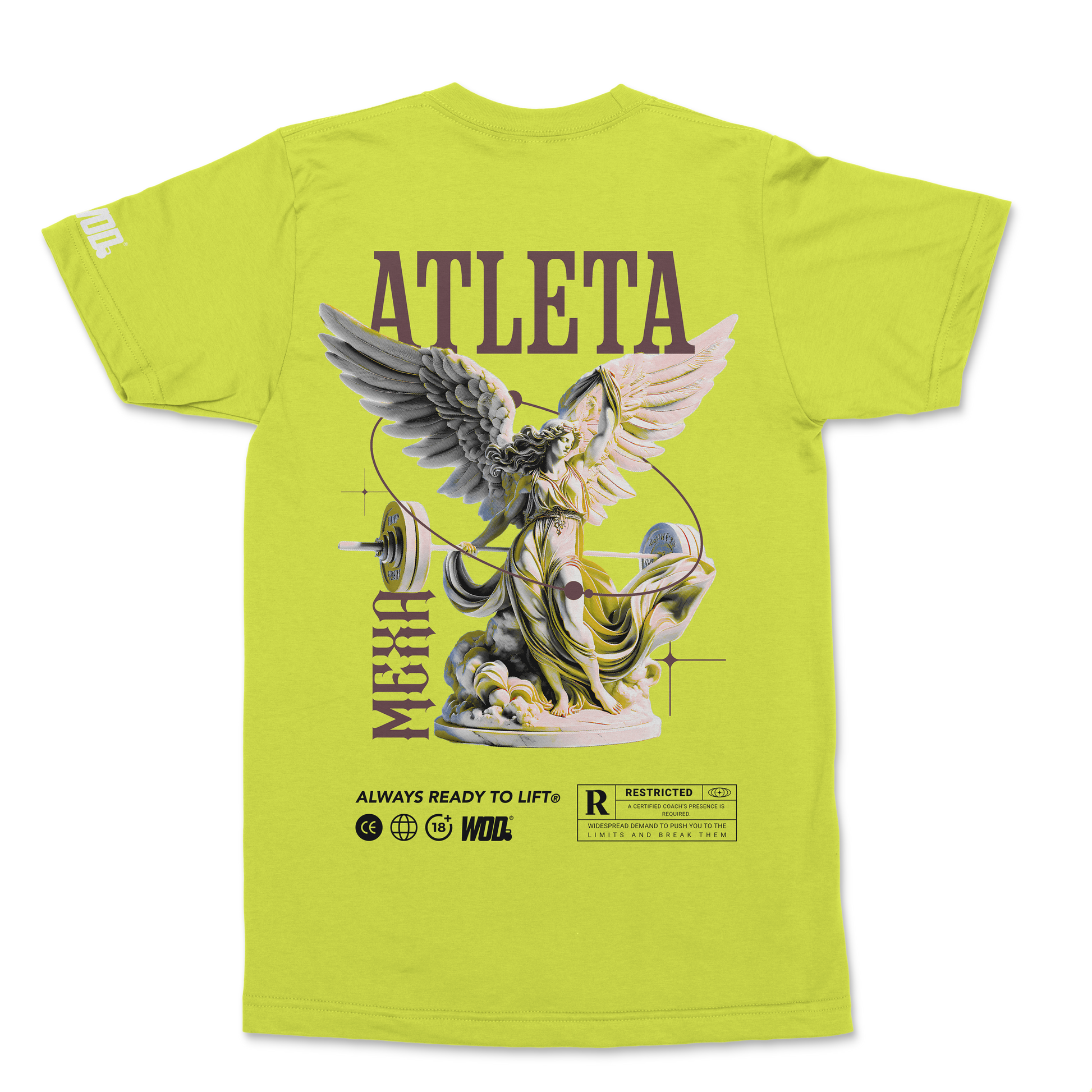En el frente, minimalismo con el logo WOD en el hombro; en la parte trasera, un arte épico de inspiración escultórica: una figura alada levantando una barra, acompañada del statement “ATLETA MEXA”.