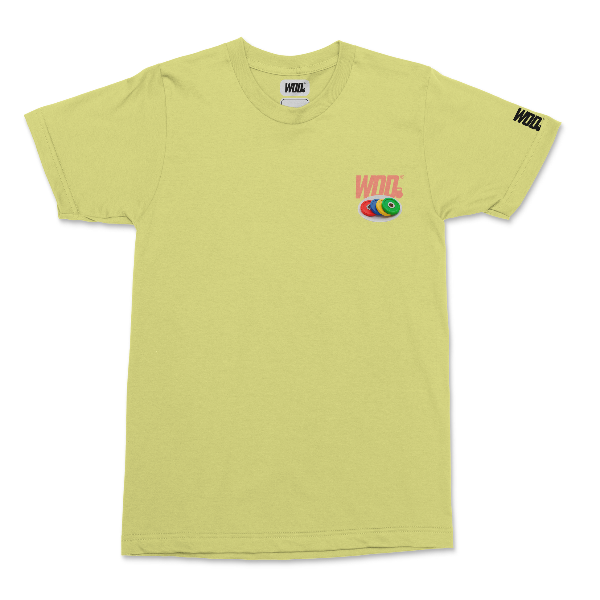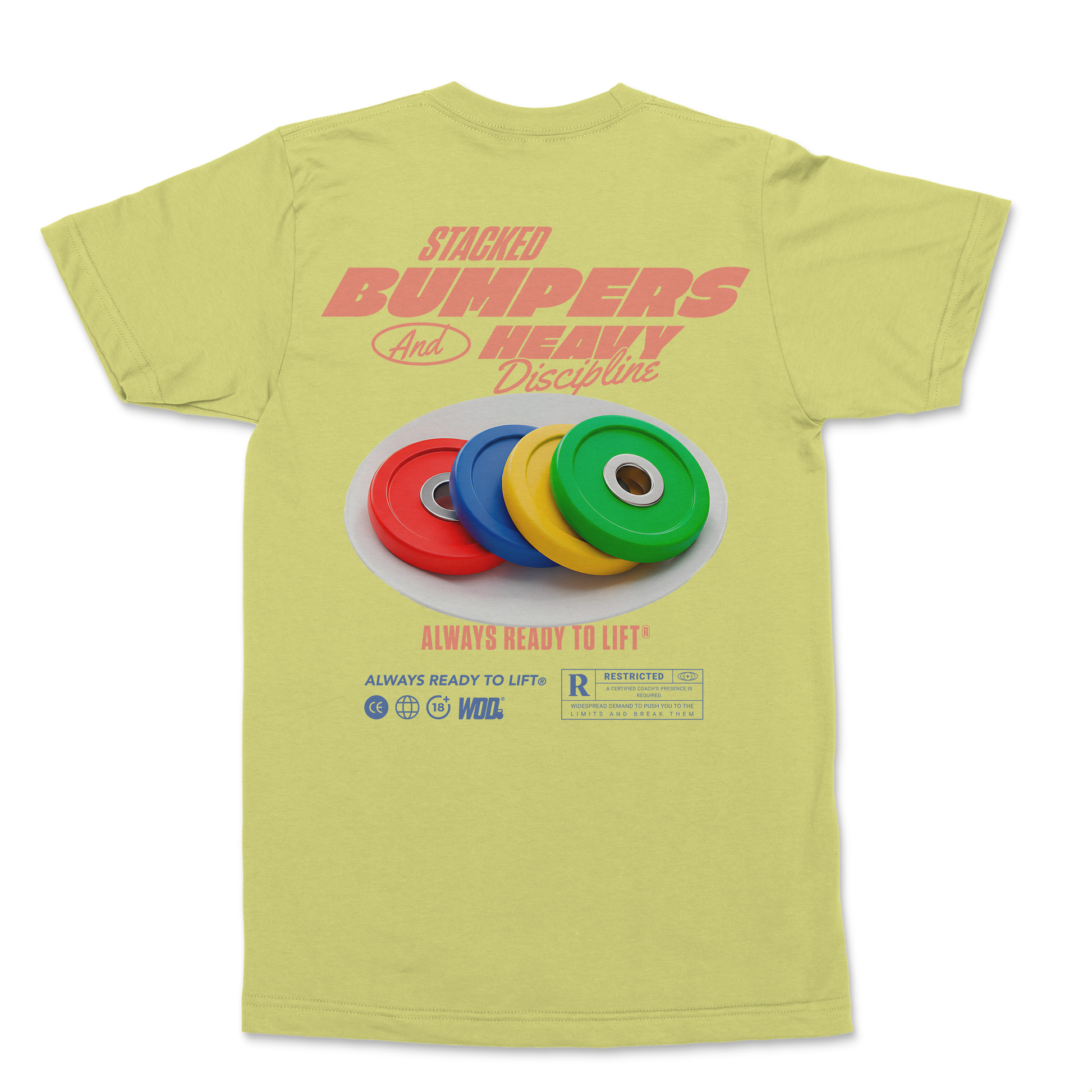 Playera WOD® corte básico en color Yellow Mist. Diseño trasero con bumpers multicolor y la frase “Stacked Bumpers and Heavy Discipline”. Frente con logo WOD® y bumpers al pecho. Tela premium de algodón pesado. Always Ready to Lift®.